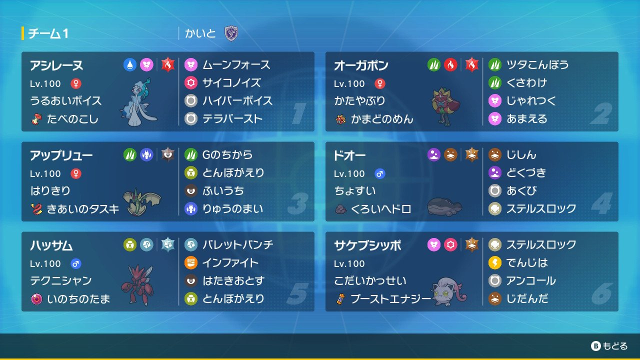 ハッサムは弱点補完等の観点から渋々、すごーく渋々入れてます(本来はとても優秀な子です)。